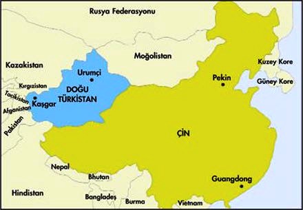 “Şin-ciang Uygur Özerk Bölgesi” adıyla otonomi verilen, nüfusu Çinli göçmenler hariç Çin yönetiminin bütün inkârlarına rağmen 35 milyonu geçen ve başkenti Urumçi olan Doğu Türkistan’da; Kaşgar, Aksu, Hoten, Sayram, Turfan, Urumçi (Beşbalık), Kumul (Hami), Yarkent, Gulca gibi tarihî Türk şehirleri bulunmaktadır.